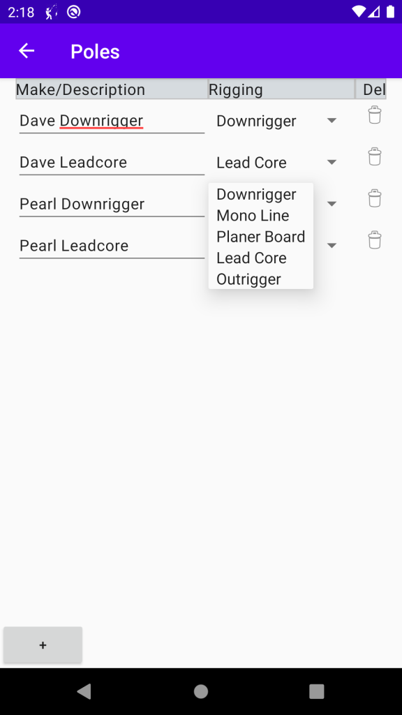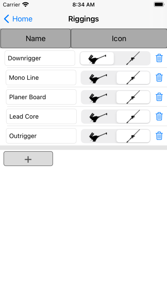 A Rigging is how the type of setup for the fishing pole. The selected Icon is associated to the Pole, and will be displayed on the Main Screen.