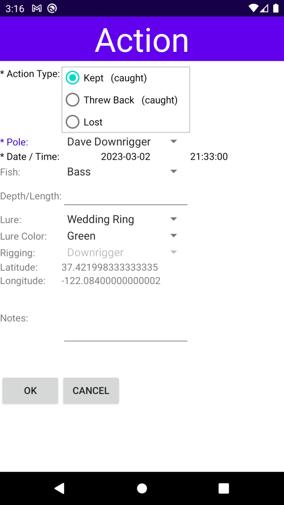 Tapping the pole will give you an entry screen (below) to enter the fish information.