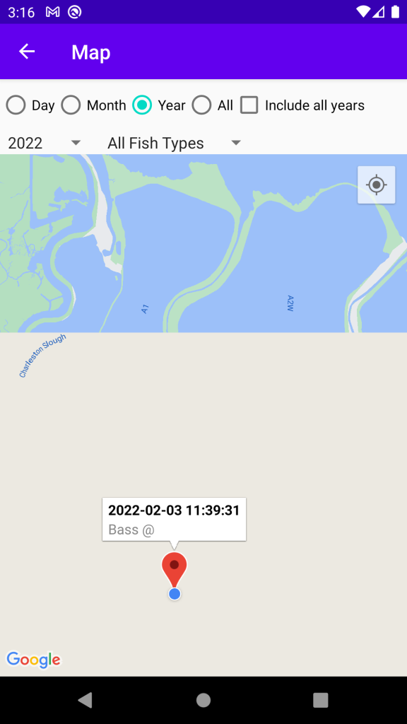 The GPS Coordinates will be captured (location detection is required). You will be able to see the the “caught” fish on the map (below).